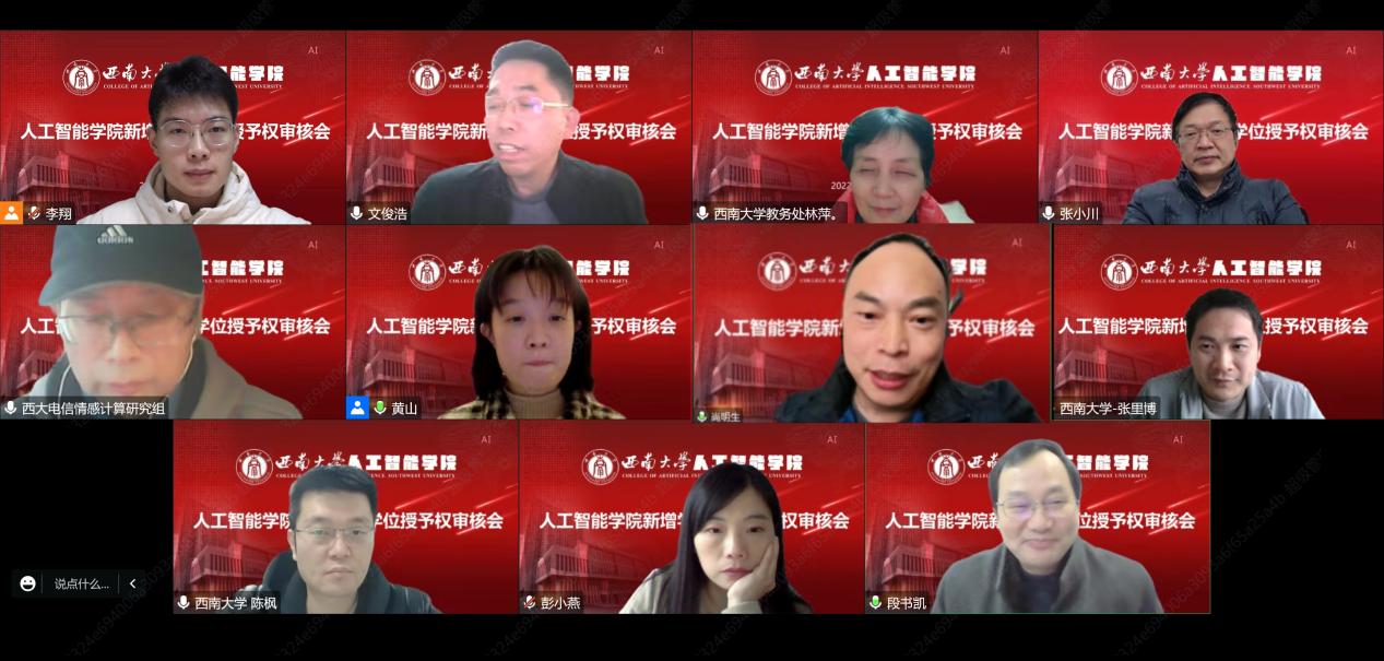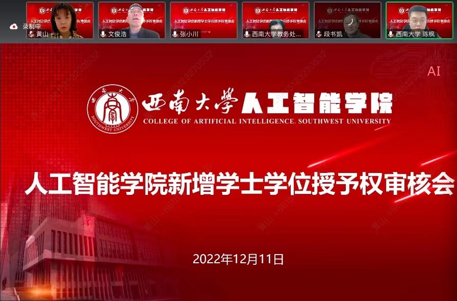 根据重庆市学位委员会办公室开展学士学位授权审核工作的相关要求,结合《西南大学新增学士学位授予权自主审核方案》(西校〔2022〕68号)的相关规定,12月11日,学院线上举办新增学士学位授予权审核会。根据学校文件审核流程要求,会议邀请重庆大学大数据与软件学院党委书记文俊浩教授、重庆理工大学两江PA视讯集团副院长张小川教授、中国科学院大学(重庆)PA视讯集团副院长/大数据中心主任尚明生教授等校外专家,电子信息工程学院刘光远教授、西南大学教学督导林萍副研究员等校内专家共五名担任评审专家。学院院长段书凯,系主任陈枫、彭小燕,张里博老师以及教学办相关人员参加此次审核会。会议由智能科学系系主任陈枫主持。