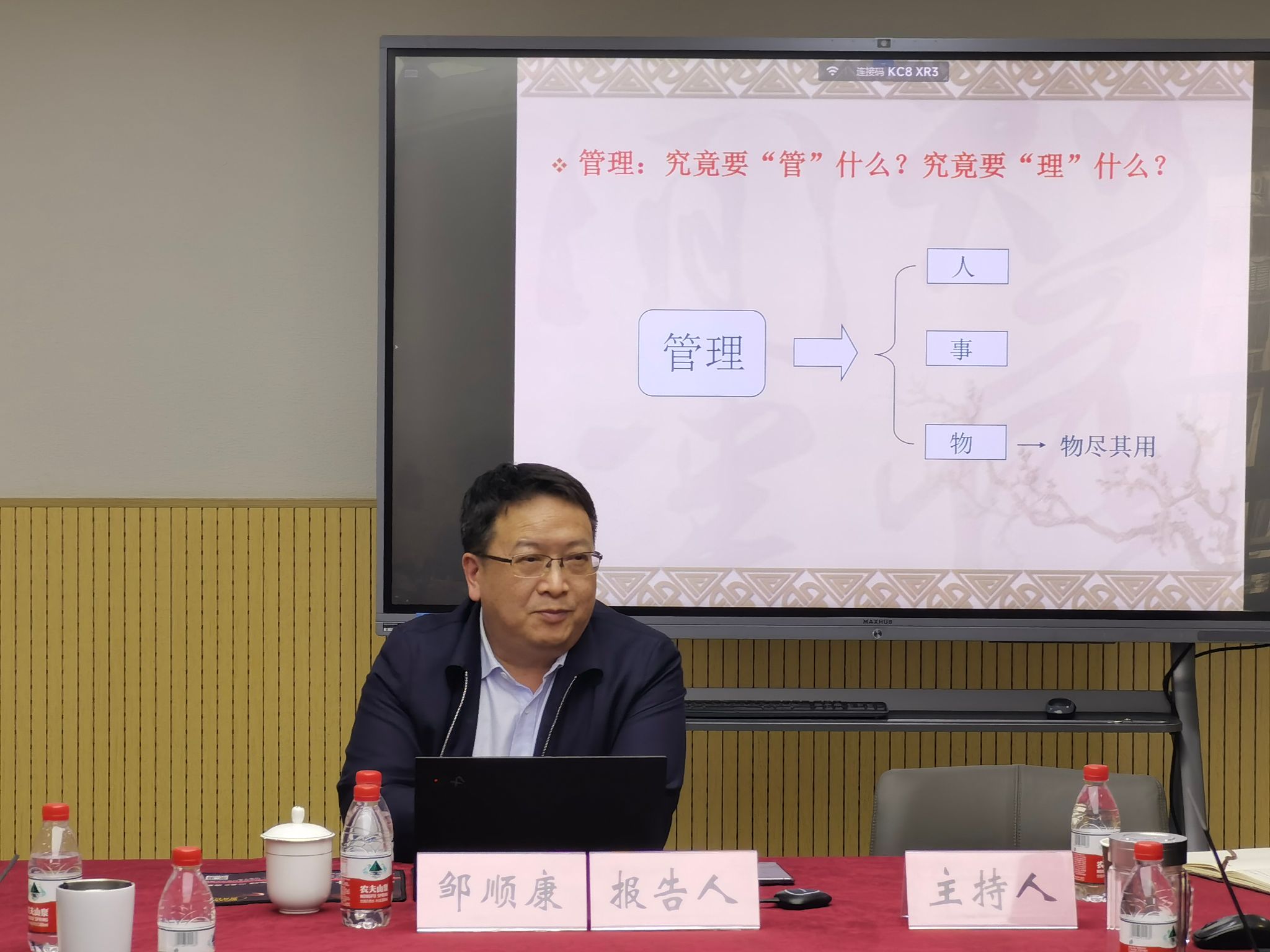会议立足贯彻《全国干部教育培训规划(2023-2027年)》精神、持续深化巡察整改成果,围绕“干部素养能力提升”,邀请西南大学基础教育投资管理有限公司总经理、教育部“国培计划”师资库国家级培训专家邹顺康教授作专题辅导报告。邹教授以《二级学院管理干部综合素质提升》为题,从“管理”的概念剖析引入,引经据典,结合丰富案例,从管理的内容、影响管理效能的“素质”要素、管理干部的素质要求等方面作详细阐述,为学院干部上了一堂生动的管理能力培训课。