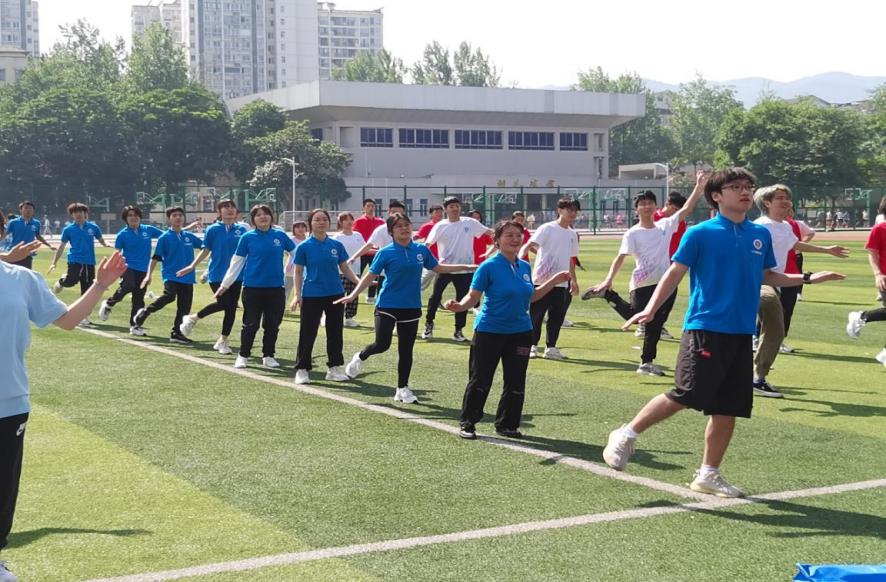 五个学院的领导老师带领着五十名青年大学生齐聚第四运动场,在《本草纲目》的音乐声中跳起健身操。为避免受伤,活动选择较为简单的版本并充分热身。旋律响起,现场青年学子们在领操的指挥下充满朝气地跳跃和舞动,迅速吸引了运动场上的师生。欢快的节奏,简单的动作,让大家都不由自主跟着一起动起来,队伍越来越庞大,气氛越来越热烈。