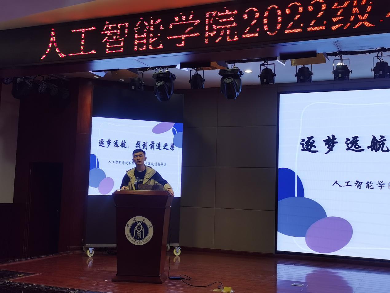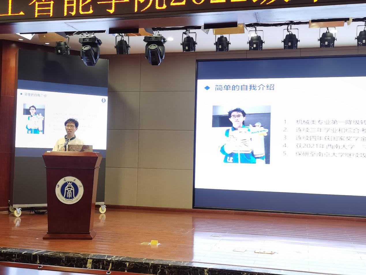 随后,2019级优秀学生代表——智科专业郭聪同学作朋辈经验分享交流,从学习经验、竞赛经验、科研经验、学业外生活等方面介绍了大学应该如何度过,告诫22级同学们应当找到适合自己的学习方式、积极参与竞赛和科研,强调知识、汗水、灵感、机遇不可偏废。五育并举,全面发展。
