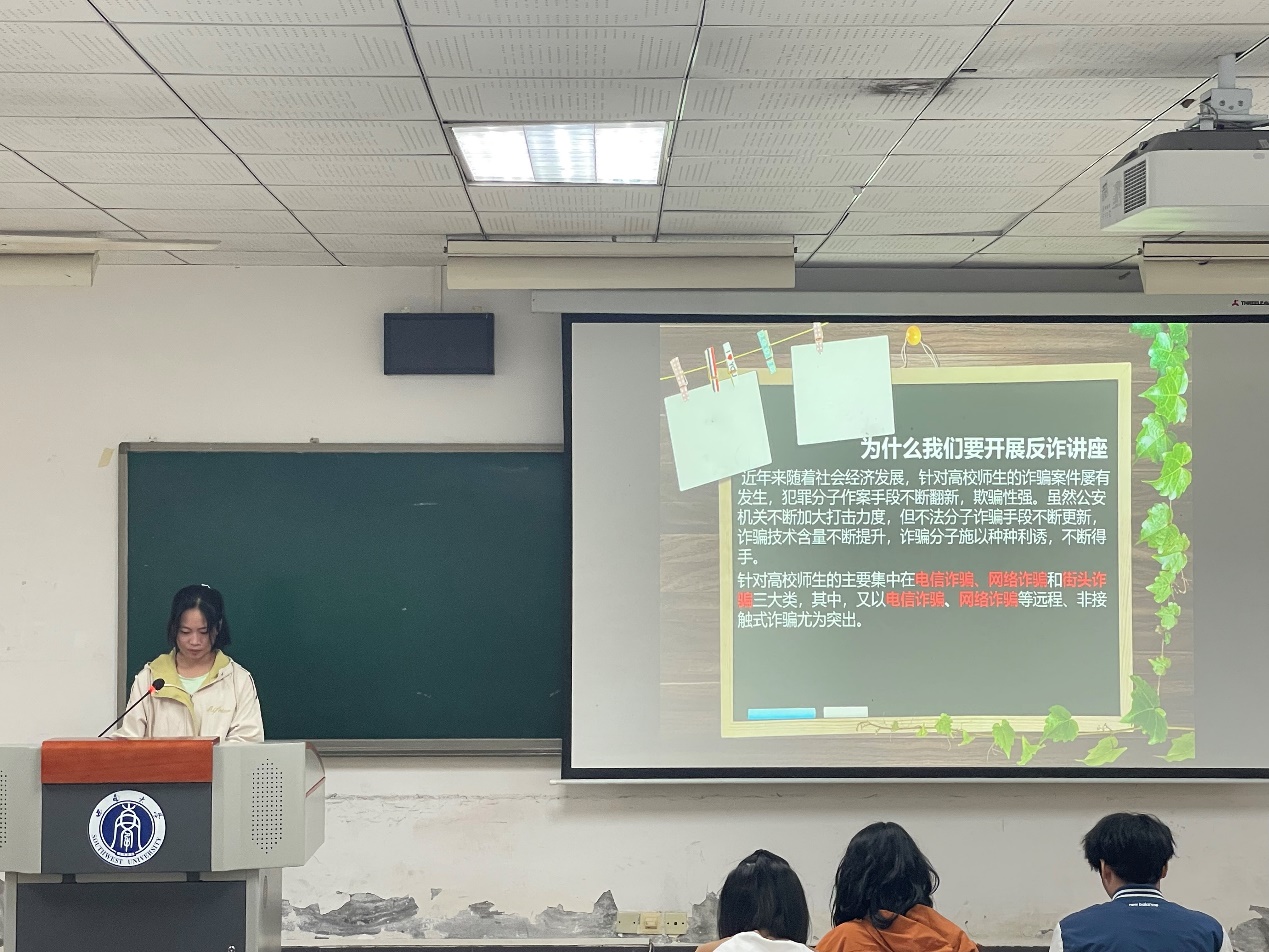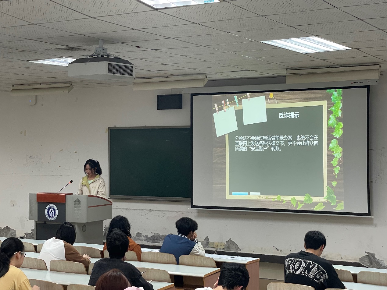 本次宣讲活动主讲人是院学生会生活权益部干事李雪蓉。她主要从开展反诈讲座的意义、诈骗类型、经典案例以及如何预防诈骗四个方面为同学们进行讲解。