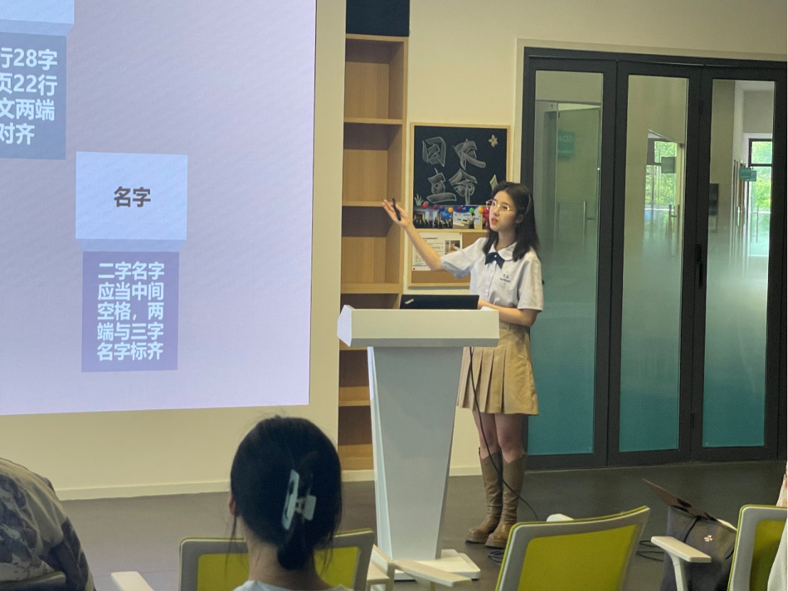 随后,校团委宣传部负责人王增增向大家讲解了公文写作技巧与规范,从公文材料格式要求、语言注意事项、逻辑注意事项三个大块向大家传授经验,帮助团学骨干们更好地了解公文写作要求与规范,增强提高大家的实践与执行能力。