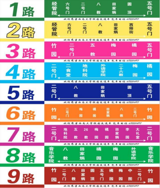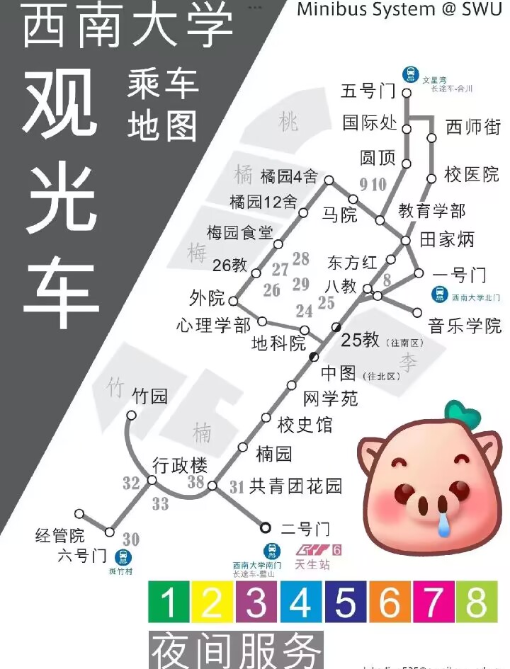 二号门距离地铁6号线西南大学站1号口仅两百米,校外还有公交、共享电瓶车可选择,交通十分便利。