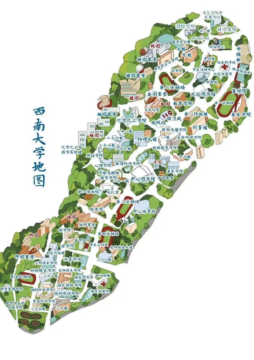 Ps.西大由于占地面积广且地图星状分布类似长条状,故习惯上将其分为南北两区,而我们人工智能的学生都住于北区。