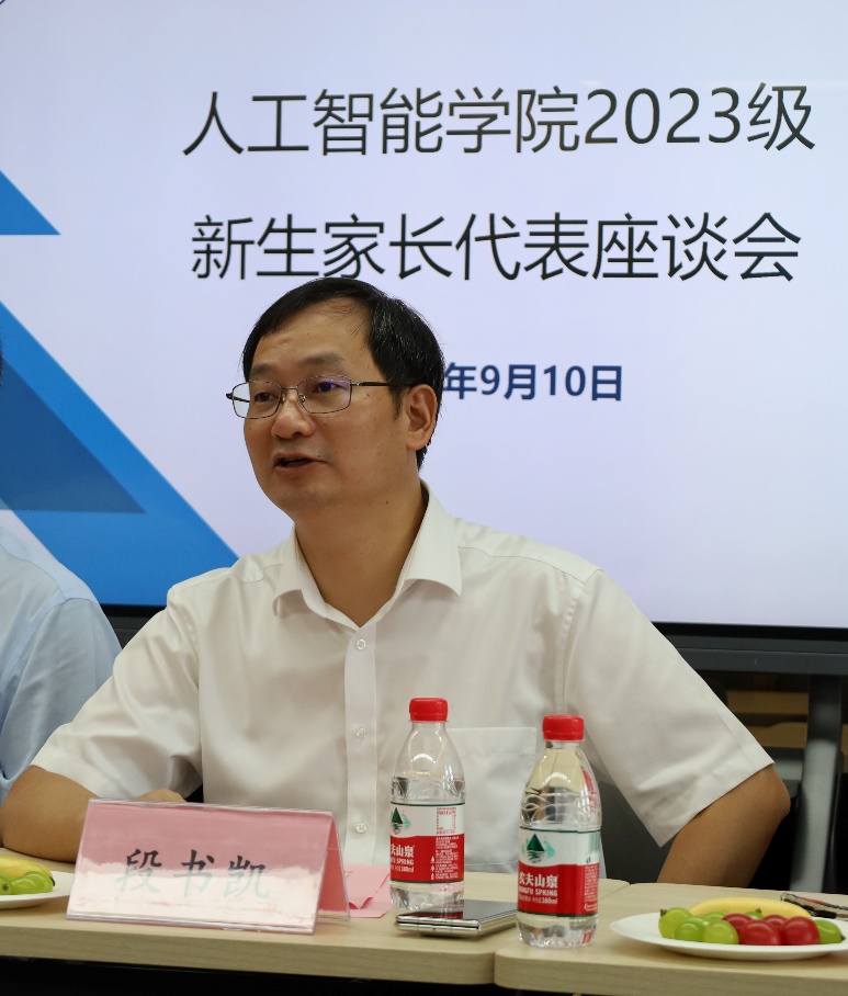 学院院长段书凯对家长代表的到来表示欢迎,段院长首先详细介绍了学院整体情况,学科建设,师资力量,人工智能发展前景,其次,段院长以自身求学经历,成长经历为新生家长指点迷津,解答了大学是什么、大学生活应当如何度过、大学生应该如何成长成才等问题,段院长希望家长朋友转变观念,共同培养出有家国情怀、独立自信的AI青年。