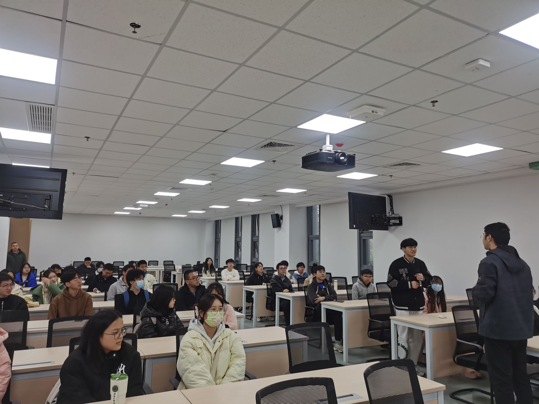 参观开始,陈主任为同学们讲解当代人工智能发展现状及前沿问题,从市场角度剖析人工智能领域的人才需求,并从基础学习、实践能力、行业前景等各方面回答同学提问。