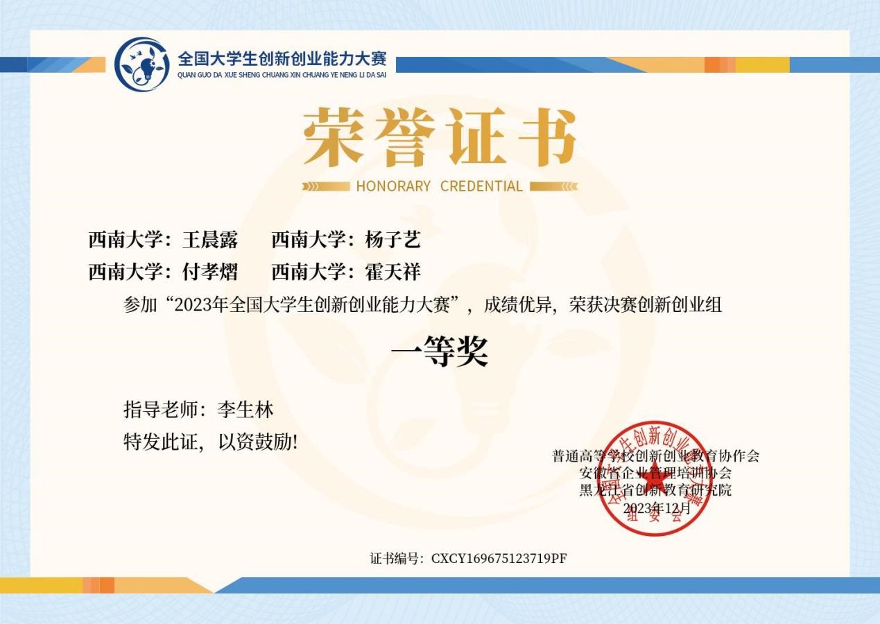 近日,2023年全国大学生创新创业能力大赛决赛落下帷幕,我院斩获“创新创业组”全国一等奖、优秀指导教师奖。