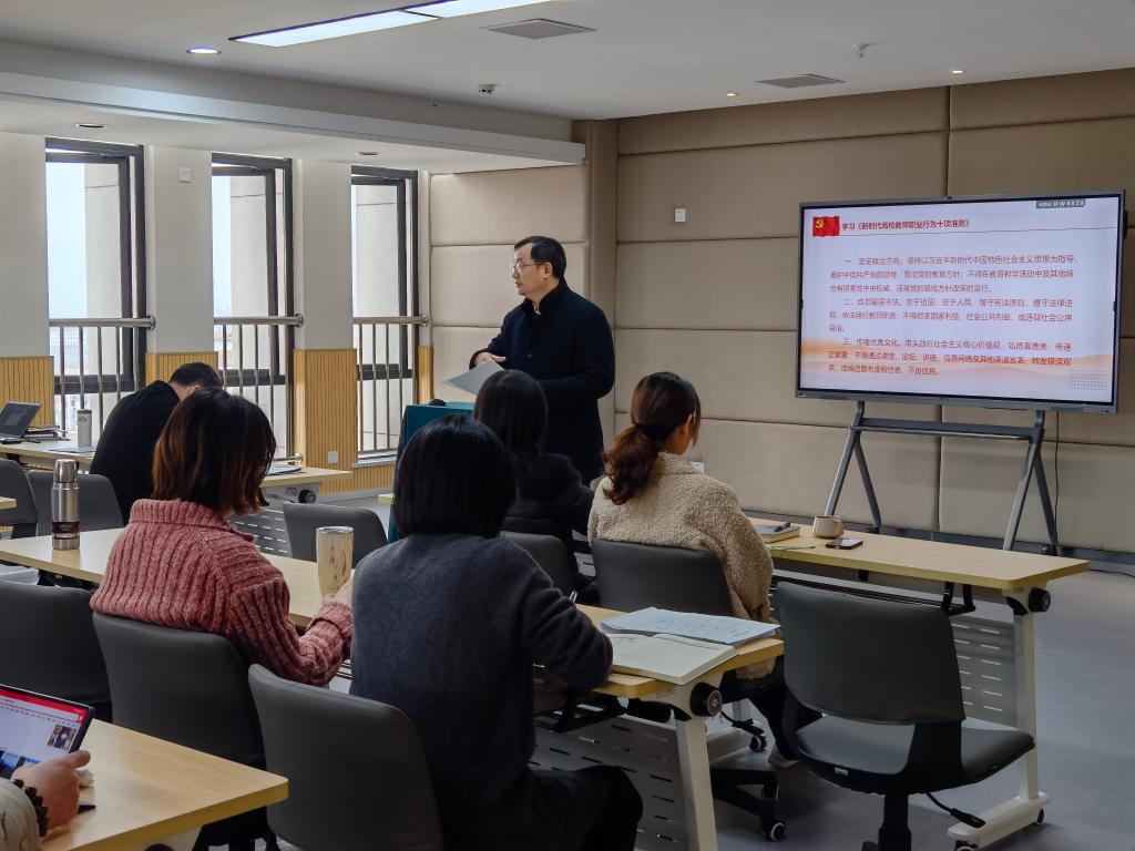 会议首先进行政治理论集中学习。夏俊带领大家以视频学习、分享学习心得相结合的方式,学习了习近平总书记在省部级主要领导干部学习贯彻党的十九届六中全会精神专题研讨班开班式、十九届中央纪委六次全会、中央全面深化改革委员会第二十四次会议上的重要讲话精神。学院院长、党总支副书记段书凯带领大家逐条学习了《新时代高校教师职业行为十项准则》,结合工作实际进行了详细解读,强调全体教职工要规范职业行为,严守师德底线,做好教书育人的表率。夏俊就相关具体要求作了补充强调。