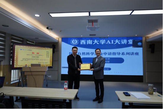 最后,段书凯院长向王国胤教授颁发了“西南大学AI大讲堂特邀报告人”致谢纪念牌,并对他的到来和精彩的报告表示衷心的感谢。