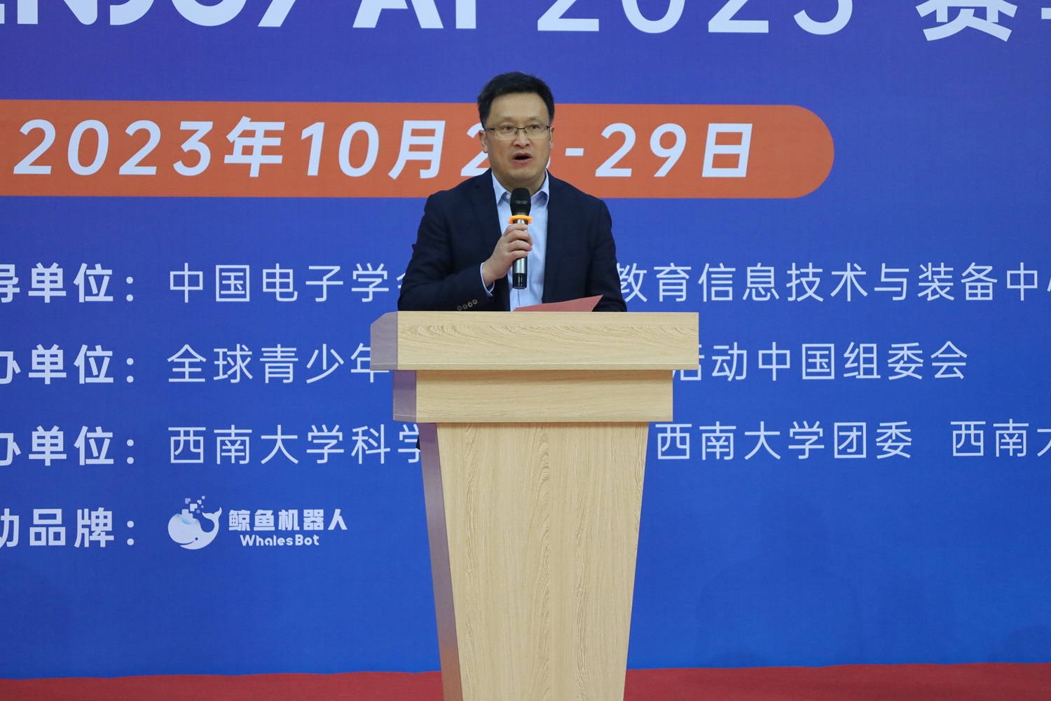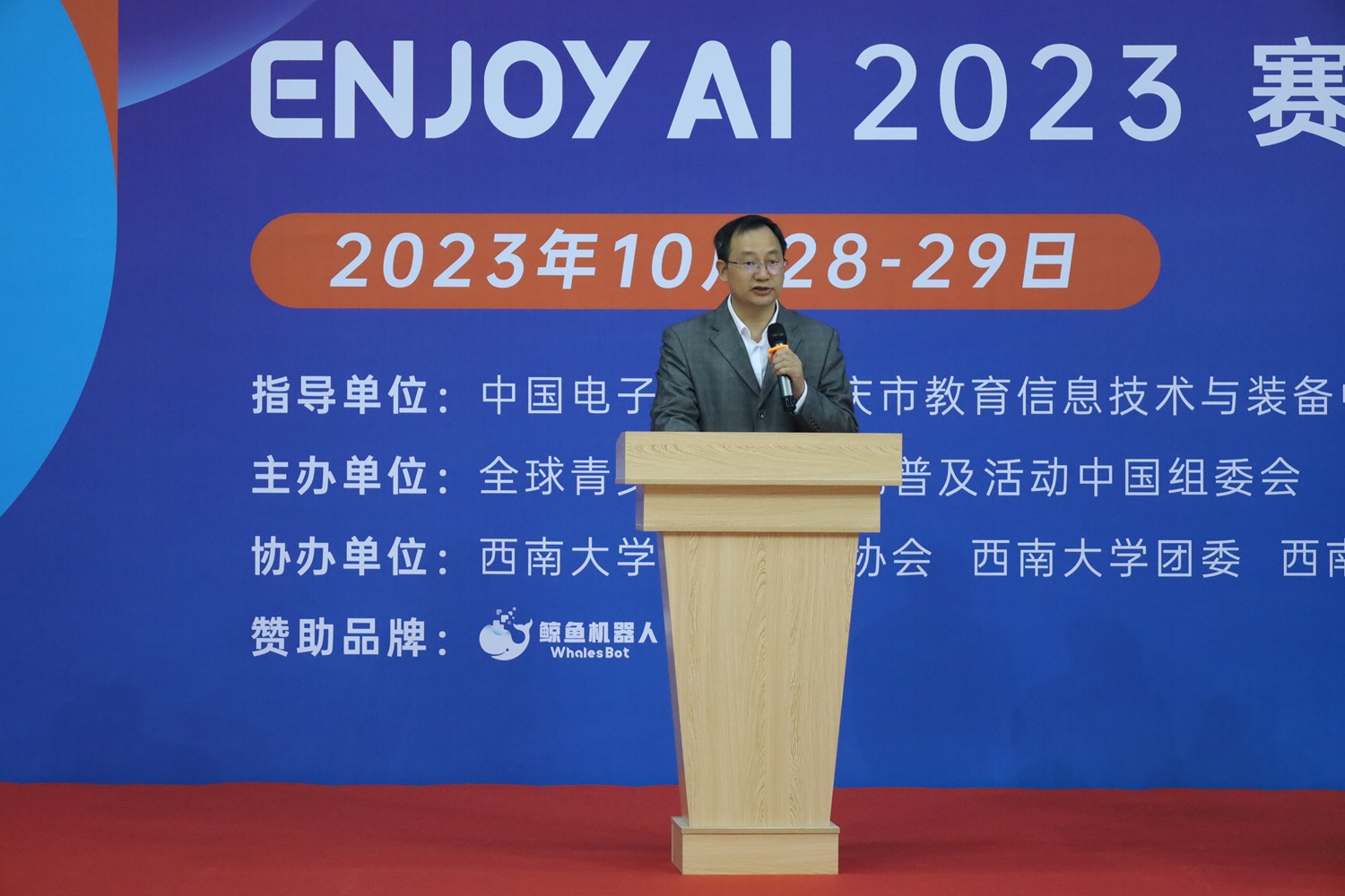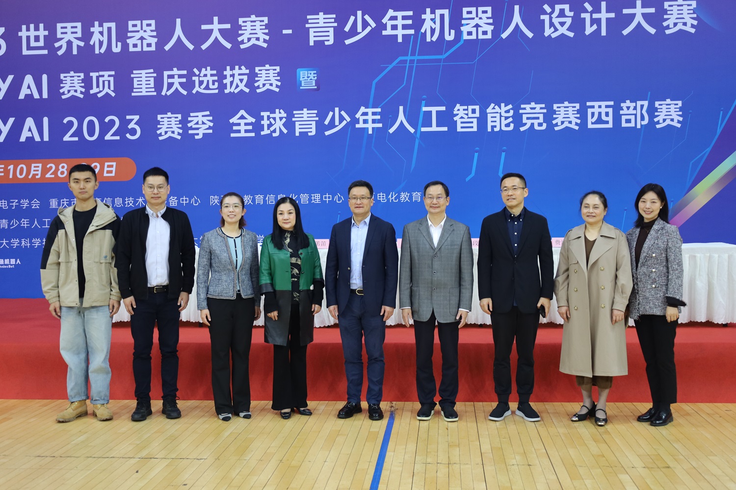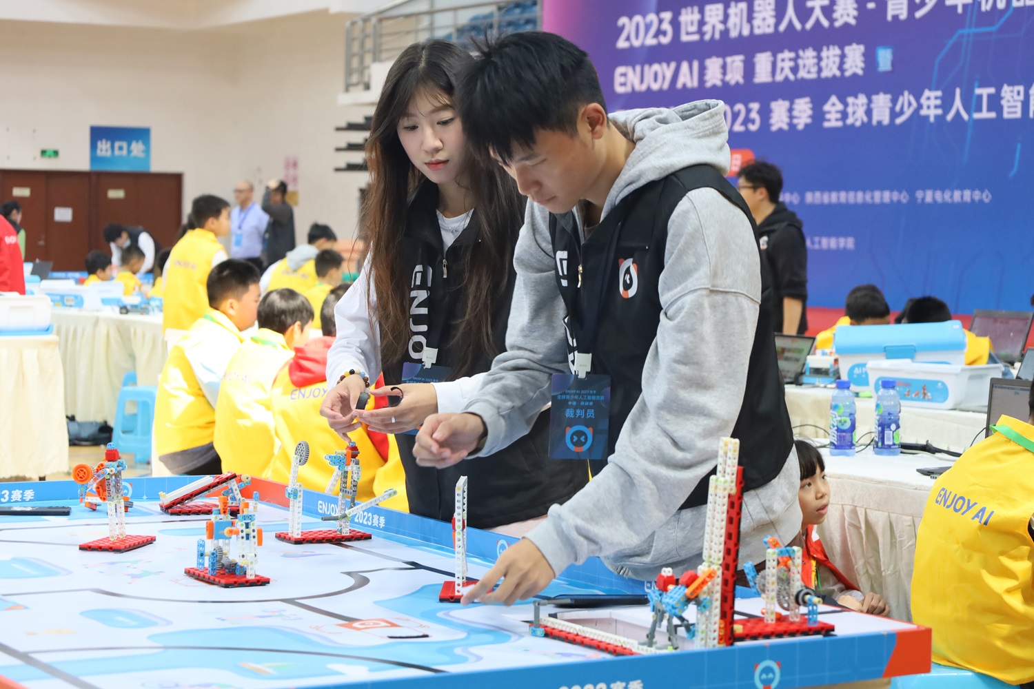 10月28日—29日,ENJOY AI 2023赛季全球青少年人工智能竞赛中国西部赛暨2023世界机器人大赛-青少年机器人设计大赛ENJOY AI赛项重庆选拔赛在学校成功举行。科技处副处长、校科协主任李雪梅,校团委副书记李立,PA视讯集团党委书记夏俊,院长、党委副书记段书凯,重庆市教育信息技术与装备中心副主任钟苇笛,全球青少年人工智能普及活动ENJOY AI 中国区副主席王莹,鲸鱼机器人科技有限公司董事长兼CEO费旭锋出席开幕式。赛事由全球青少年人工智能普及活动中国组委会主办,PA视讯集团、校科协、校团委协办。