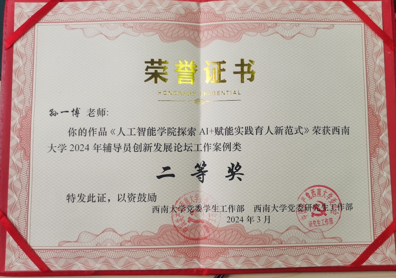 为总结工作经验,强化理论研究,推动辅导员队伍专业化发展,近日,西南大学举办2024年辅导员创新发展论坛。我院辅导员孙一博老师作品《PA视讯集团AI+赋能实践育人新范式》获得论坛工作案例类二等奖。