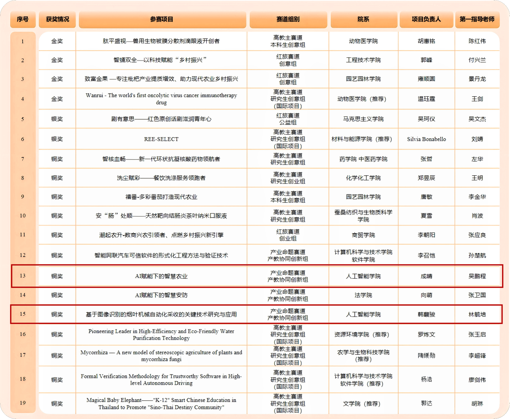 备受瞩目的中国国际大学生创新大赛(2024)落下帷幕,学院师生凭借卓越的创新思维、扎实的专业知识和顽强的拼搏精神,一路过关斩将,“AI赋能下的智慧农业”“基于图像识别的烟叶机械自动化采收的关键技术与应用”两个项目荣获国赛铜奖,实现历史突破!此前,学院在重庆市选拔赛中获得金奖3项,校赛奖项14项!向获奖的老师和同学们表示热烈祝贺!
