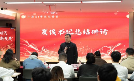 比赛最后,学院党委书记夏俊作总结讲话。夏俊书记对活动中参赛同学的精彩讲述表达了祝贺,并对活动过程中各位选手的表现进行了全面总结。他指出,此次活动不仅展现出同学们的青春与活力,更体现出大家在人工智能结合党建这个命题下的深入思考,希望大家继续保持拼搏奋斗的势头,在青春的赛道上奋力奔跑,一起踏马向未来。