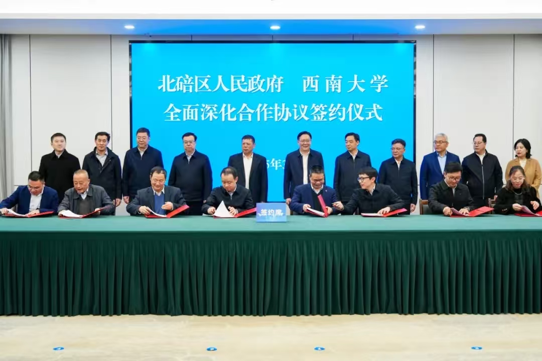 为推动校地合作提质升级,3月28日下午,学校与北碚区人民政府全面深化合作协议签约仪式在北碚区行政中心举行。北碚区委书记林旭阳,区委副书记、区长卓大林,区人大常委会主任徐永德,区政协主席董伦,区委常委、组织部部长梅玉军,区政府副区长向红;学校党委书记张卫国,校长王进军,党委副书记武好明,副校长白显良、范大明等领导出席签约仪式。