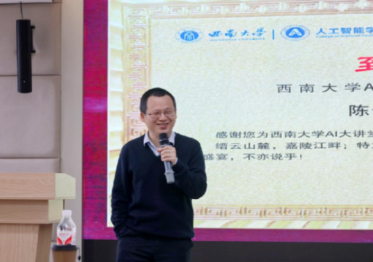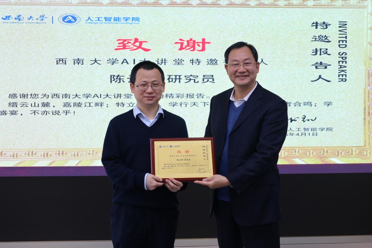 报告结束后,段书凯教授代表学院为陈云霁研究员颁发了“西南大学AI大讲堂特邀报告人”证书,并对陈云霁研究员的精彩分享表示衷心的感谢。